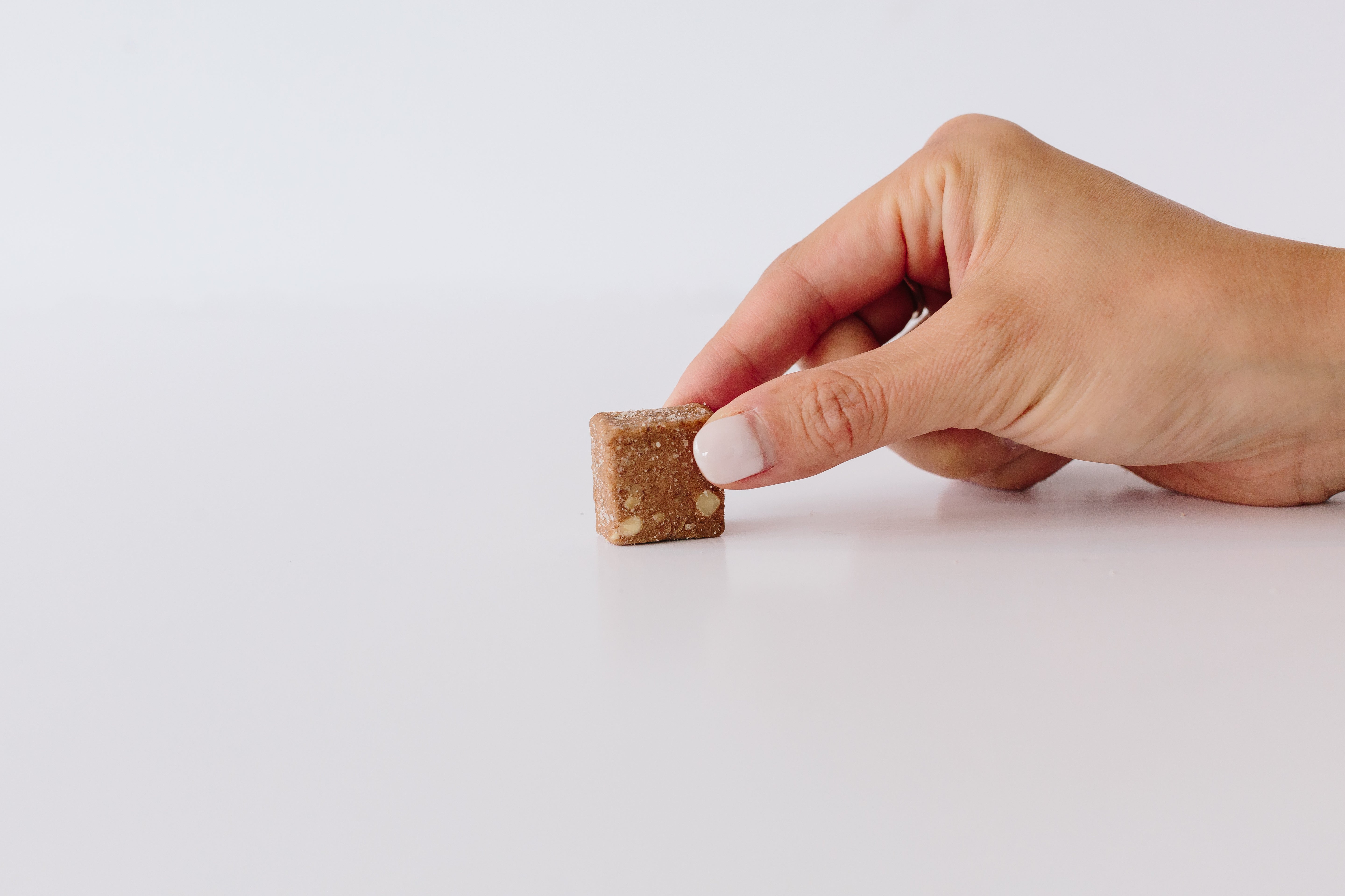 Sweetened with dates, our chews have been described as "mildly sweet," with a "nutty and caramel-like flavor." The chews are soft, with a texture compared to a snack bar, with a nutty crunch from unsalted almonds.